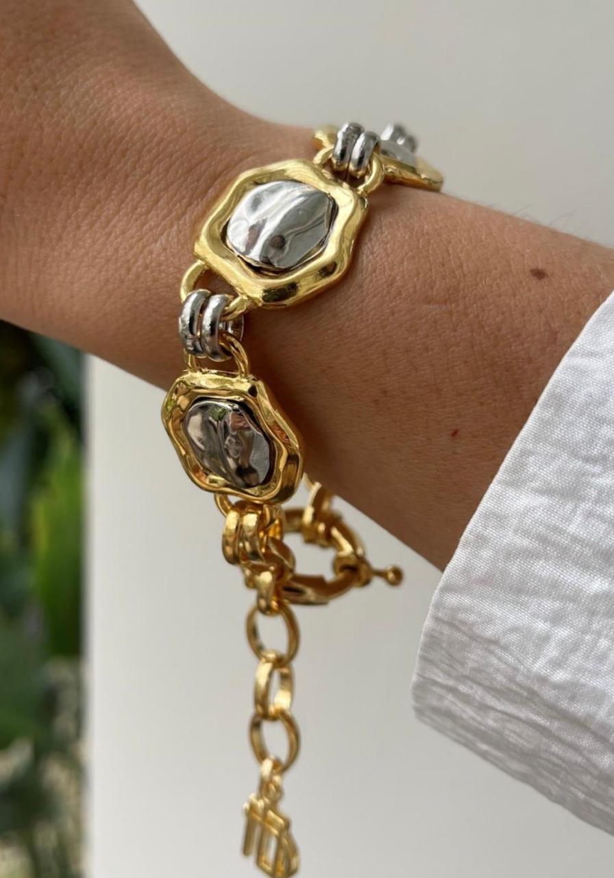 Pulseira com design moderno em mix de metais, com elos diferenciados e acabamento sofisticado.